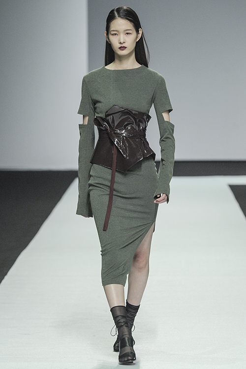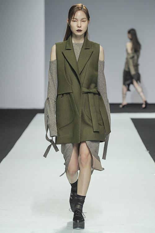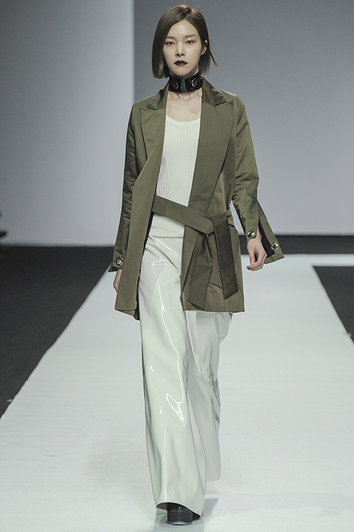 정미선 디자이너는 ‘밀리터리룩’하면 떠오르는 전형적인 공식을 따르는 대신 여체의 곡선을 강조하는 코르셋 장식과 넉넉한 품의 와이드 팬츠, 풍성한 실루엣의 아우터 시리즈 등으로 강인하면서도 정제된 스타일을 완성했다. 특히 글래머러스한 퍼 아우터와 부드러운 어깨 선을 드러내는 니트 웨어 시리즈에는 실용적인 측면을 강조했다.