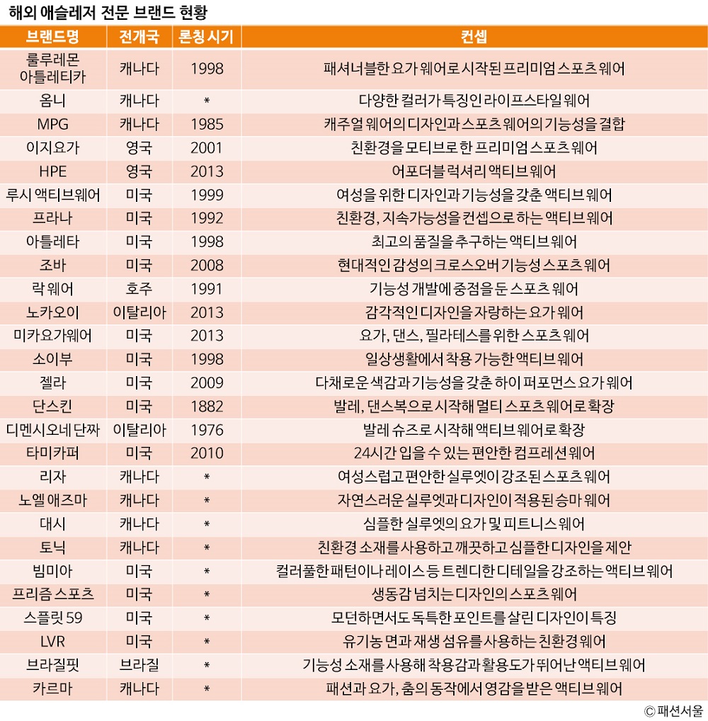 전 세계 패션 시장이 완만한 성장세를 보이는 가운데 애슬레저 시장은 쾌속 성장을 이루고 있다. 국내 패션 시장도 예외는 아니다. 최근 몇 년 새 룰루레몬 아틀레티카(lululemon athletic, 이하 룰루레몬), 옴니(AUMNIE), 빔미아(VIMMIA), 스플릿 59(SPLITS 59), 엠피지(MPG) 등 해외 애슬레저 전문 브랜드가 출범하는가 하면 편집숍까지 세를 뻗으며 더랩 108(The lab 108)과 같은 액티브 웨어 전문 편집숍까지 등장했다.