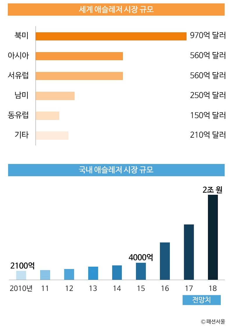 지난해 국내 애슬레저 시장 규모는 4,000억 원으로 전체 스포츠 시장 5조 원 규모의 8%를 차지했다. 국내 패션 업계는 애슬레저 시장이 3년 내 전체 스포츠 시장의 30% 수준까지 확대되고 연간 2조 원 매출을 달성할 것으로 전망하고 있다. 매년 고성장을 이어온 아웃도어 시장이 정체기를 맞은 반면 스포츠 시장의 성장세는 무서울 정도로 가파르다.
