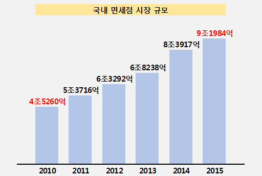 한편 국내 면세점 시장 규모는 지난 2015년 9조1984억원으로 2010년(4조5260억원)에 비해 103% 증가하며 급성장했다. 한국문화관광연구원의 ‘2014년 외래관광객 실태조사’ 보고에 따르면 해외 관광객들의 한국 여행 시 고려사항 1순위로 쇼핑(72.3%)을 들었으며 자연풍경(49.5%), 음식(41.1%), 역사 및 문화유적(25.2%), 패션(19.8%) 등이 차지했다. 그 중 쇼핑장소로는 명동(42.4%)과 시내면세점(41.4%)이 높게 나타났다. 이어 소규모상점(23.7%), 백화점(21.9%), 동대문시장(21.7%), 대형할인점(21.3%), 공항면세점(18.9%) 등의 순위를 보였다. 아울러 서울특별시가 닐슨컴퍼니코리아와 함께 조사한 2015년 보고서에 따르면 해외 관광객들의 서울방문 평균 여행예산이 229만이며, 중국이 평균 341.5만원으로 가장 많은 금액을 갖고 있다고 조사됐다. 지출 비용은 쇼핑비(110.8만원), 식사비(22.4만원), 문화오락예술비(3.0만원) 등으로 나타났다.