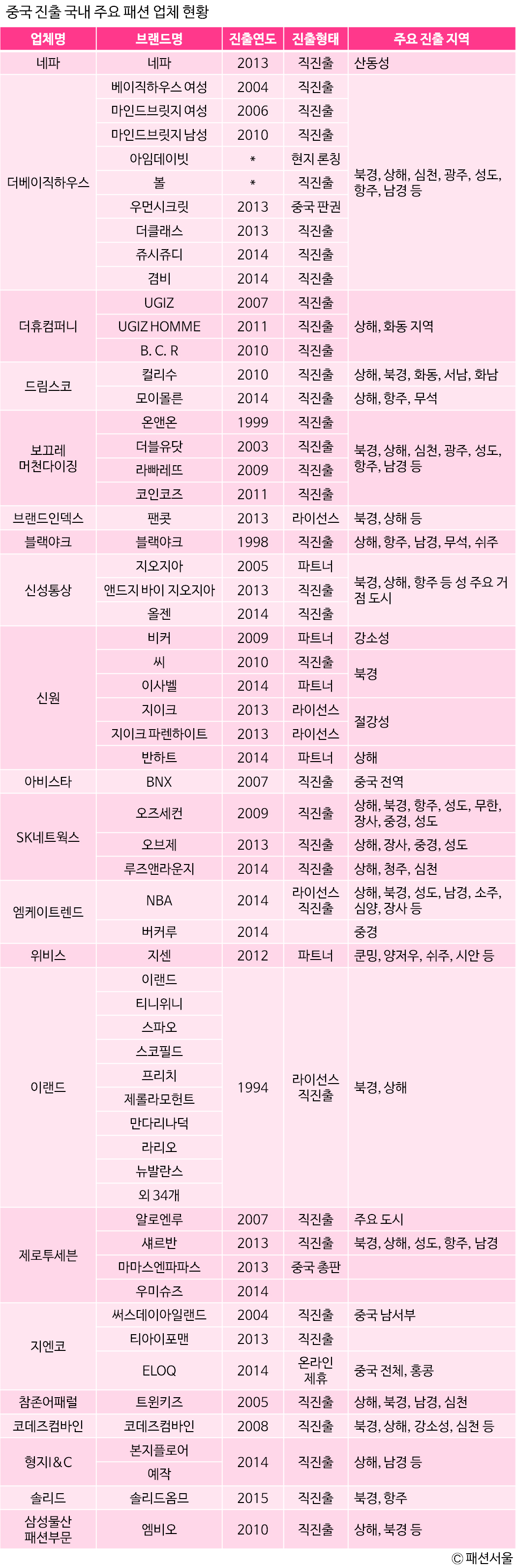 패션협회 따르면 2003년 기준 중국에 진출한 국내 브랜드는 53개, 2010년에는 130개로 두 배 이상 증가했고 2013년 177여개 브랜드가 중국에 출사표를 던졌다. 현재는 약 200여개 브랜드가 중국 시장에 진출해 있는 것으로 조사됐다.
