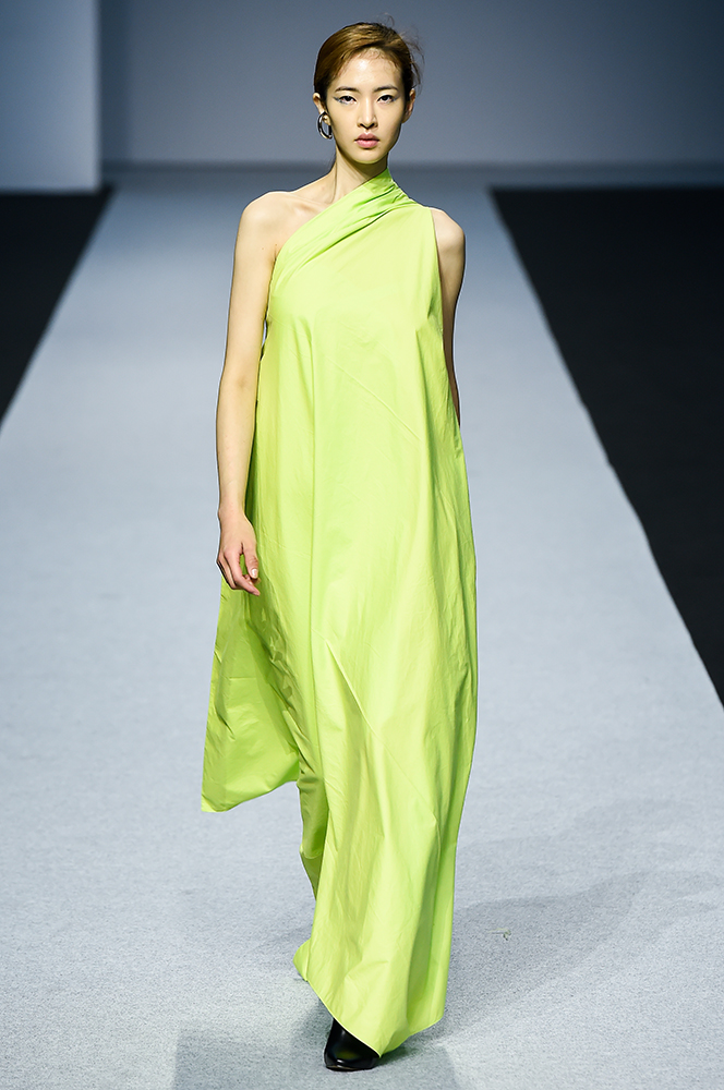 노케는 이번 컬렉션에 절제된 몇 가지 색만을 사용했지만 스타일은 다양해졌다. 최대한 간결하게 만든 라펠이 달린 베이지색 바지 정장은 무릎 아래쪽을 절개해 봄날의 가벼운 기운이 느껴졌다. 종이접기처럼 재단한 비대칭 소매의 연녹색 상의와 드레스는 연이어 등장한 광택 있는 검정 펜슬 팬츠와 부드럽게 어울렸다.