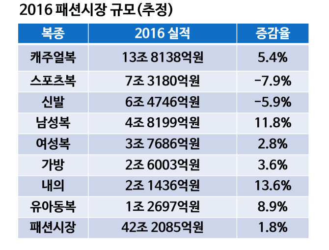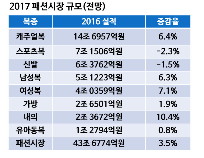 이러한 상승세를 이어서 2017년에는 3.5% 성장을 전망했다. 불안한 정국, 부진한 수출 그리고 침체된 내수가 성장전망의 큰 변수가 될 수 있으나 패션시장은 소비자의 니즈가 성장동력이므로 소비자가 필요로 한 제품과 서비스를 제공할 경우 극복할 수 있다는 판단이다.