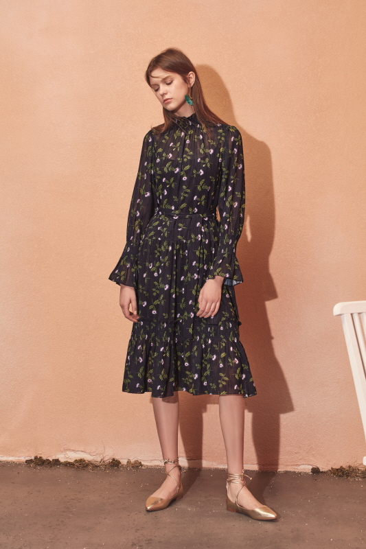 스커트와 소매부분에 셔링 디테일이 들어가 보다 볼륨감 있는 실루엣으로 만들어 주고 있어 한 층 여성스러움을 배가 시켜주며 얇고 시어하지만 조직감 있는 쉬폰 소재이기에 간절기 아우터와 함께 매치하여 봄의 설렘을 미리 느껴보자.