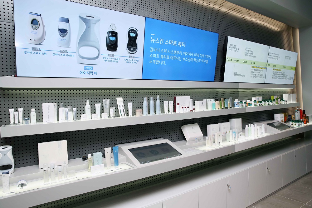 특히 이번에 새롭게 선보인 ‘디지털 프로덕트 디스플레이’ 공간에서는 QR 코드 스캔으로 뉴스킨 모바일 애플리케이션과 연계해 주문까지 연결되는 원스톱 서비스가 가능하다. 실제 제품 체험뿐 아니라 디스플레이 화면을 통해 제품을 알아보고 확인한 정보를 공유할 수도 있다. 또 NFC 태그를 통해 매장 방문객들이 가장 관심 있게 살펴본 제품 랭킹도 확인할 수 있다.