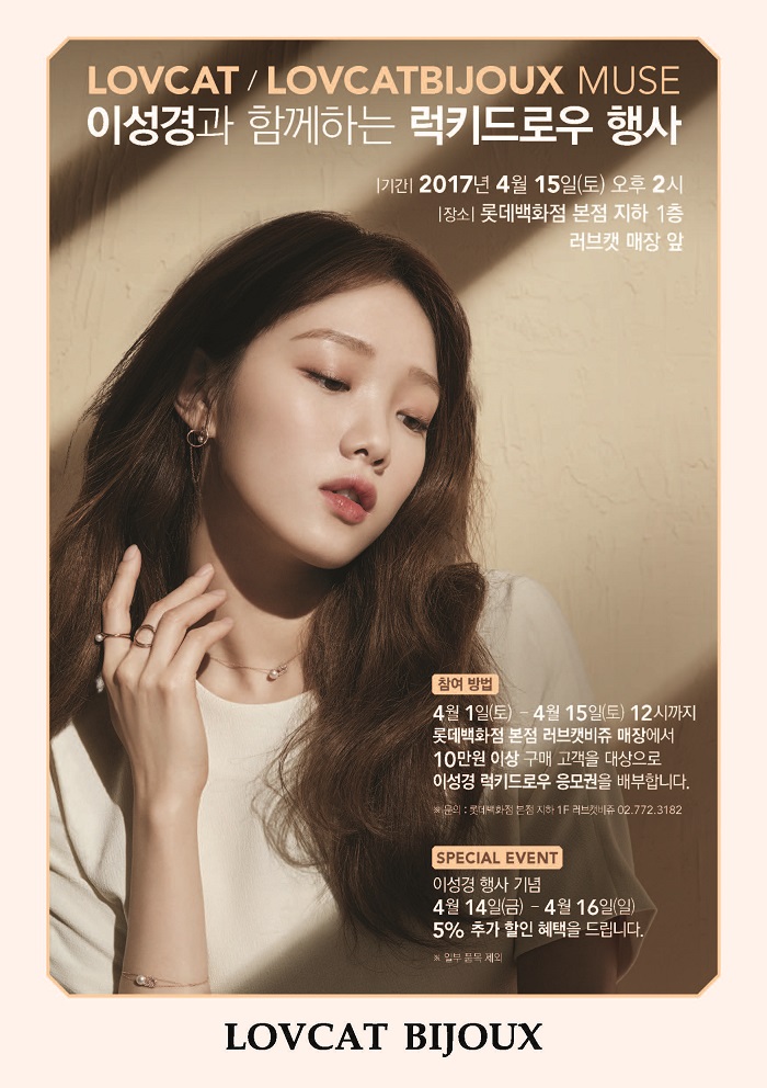 러브캣비쥬가 오는 15일 롯데백화점 명동 본점에서 이성경과 함께 럭키드로우를 개최한다고 밝혔다.