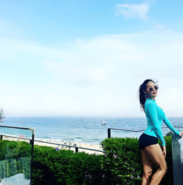 사진 속 미나는 래쉬가드를 입고 숙소에서 해변을 배경으로 포즈를 취하고 있다. 특히 래쉬가를 입고 S라인을 만들어 네티즌들의 시선을 사로잡았다.