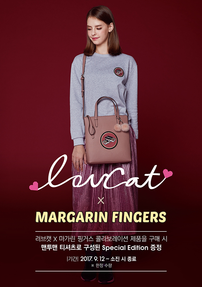 러블리하고 데일리한 감성의 러브캣이 위트있는 마가린 핑거스의 그레픽과 만나 트렌디하면서도 유니크한 캐주얼 백 컬렉션을 선보인다. 무엇보다 합리적인 가격대와 제품 구매 시 한정 수량 콜라보레이션 맨투맨 티셔츠를 함께 스페셜 에디션으로 구성해 개학 시즌 20대 대학생들에게 많은 사랑을 받을 것으로 기대된다.