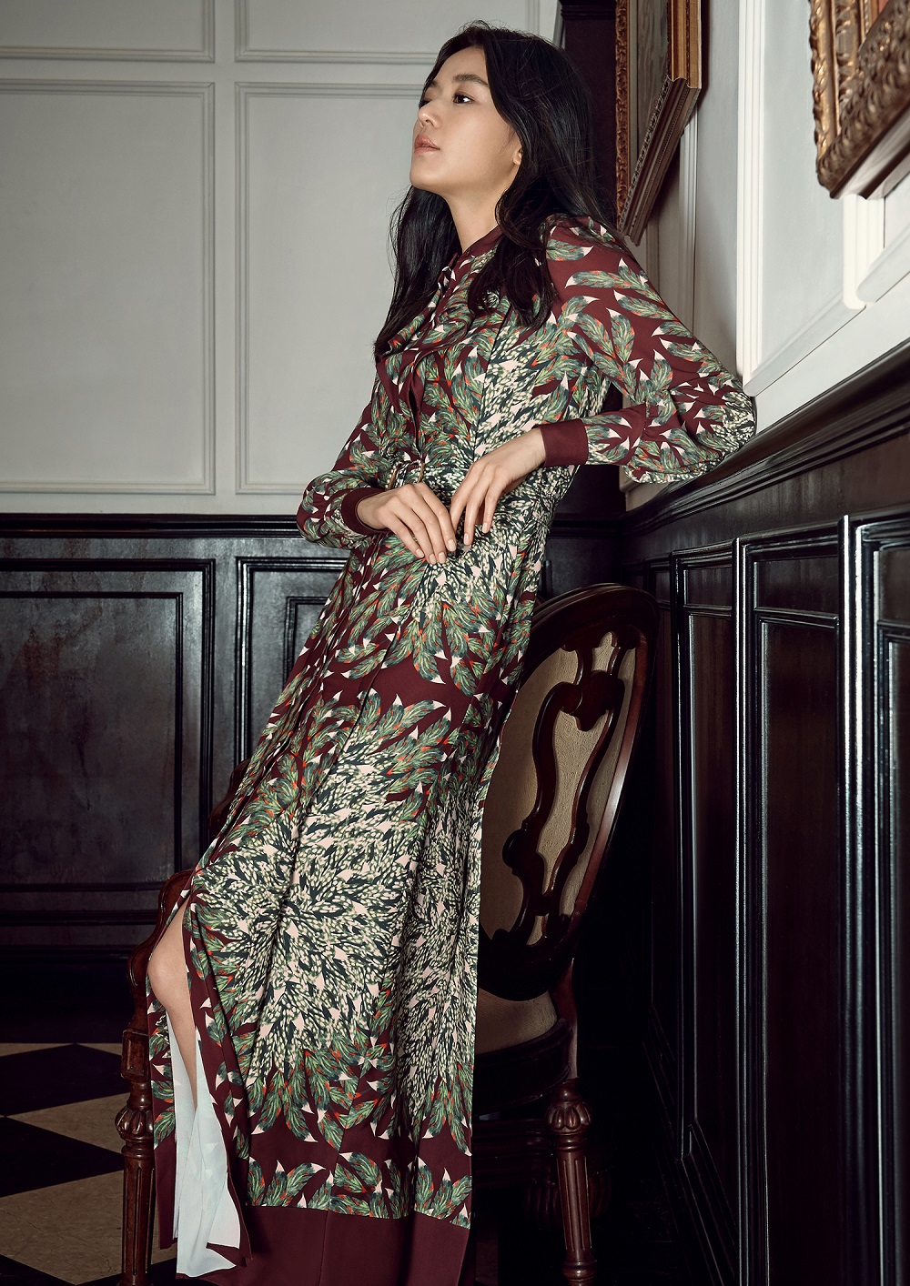 화보 속 전지현은 과감하면서 대담한 프린트 원피스와 블라우스로 화려함을 세련되게 표현했고 가을의 깊은 멋을 전해주는 코트와 원피스, 무스탕으로 클래식하면서도 우아한 기품을 선보이며 그 어느 시즌보다 강렬한 아름다움을 만들어 냈다.