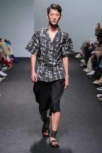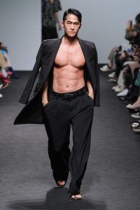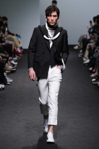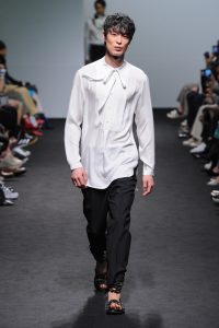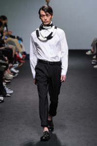 빛나는 소재의 가죽 재킷과 가죽 샌들, 테일러 수트와 체크 셔츠 등으로 거친 남성의 모습과 동시에 자유로운 젊음을 표현했고 검은색과 흰색이 반복되는 밧줄 모양의 디테일, 자켓 위부터 발끝까지 늘어진 화려한 블랙 머플러로 아방가르드 한 아트웨어 디자인 까지 함께 담아내었다.