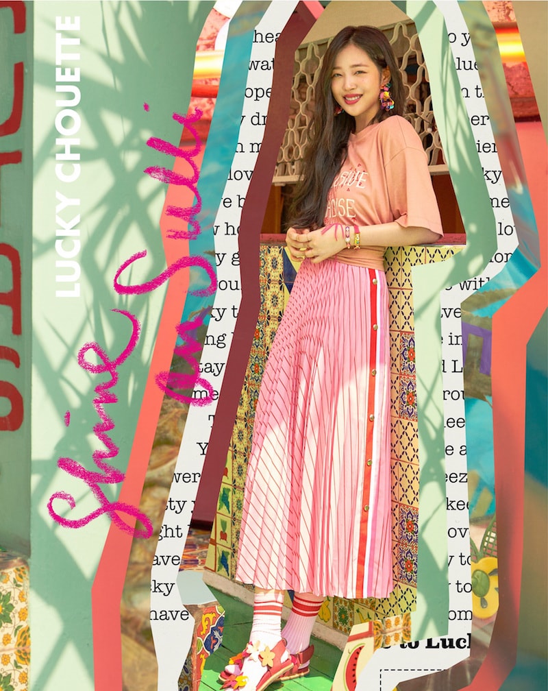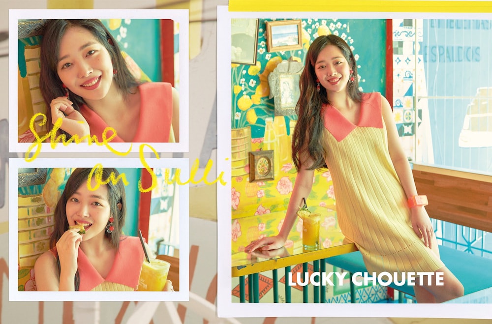 사랑스러운 설리의 모습과 럭키슈에뜨의 리조트 컬렉션이 어우러진 화보 촬영 현장 동영상과 리조트 컬렉션은 럭키슈에뜨 공식 온라인몰을 통해 만나 볼 수 있다.
