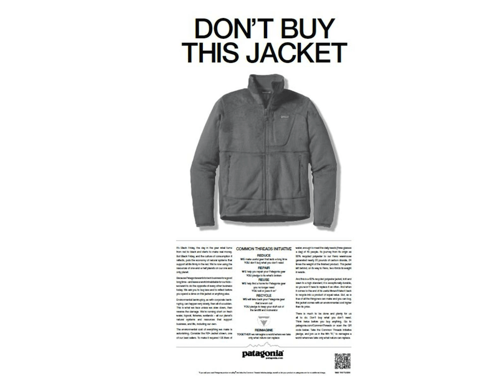 실제 윤리적 패션의 성공적인 마케팅 사례에는 2011 년 Patagonia 의 ‘Do not Buy This Jacket’ 캠페인을 들 수 있다. 이 캠페인은 소비자들에게 구매를 종용하는 것이 아닌 물건을 최대한 적게 구입하고 구입한 옷을 오래 입을 것을 촉구했다. 고객의 구매를 줄이겠다는 기본경제원리에 벗어난 이 마케팅 캠페인은, 역설적이게도 그 다음 해인 2012 년 매출이 30%나 급증하며 성공적인 캠페인으로 거듭난다. 소비자들이 주목한 것은 오랫동안 입을 수 있는 고품질의 옷이었던 것이다.
