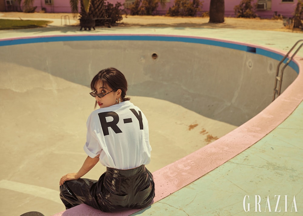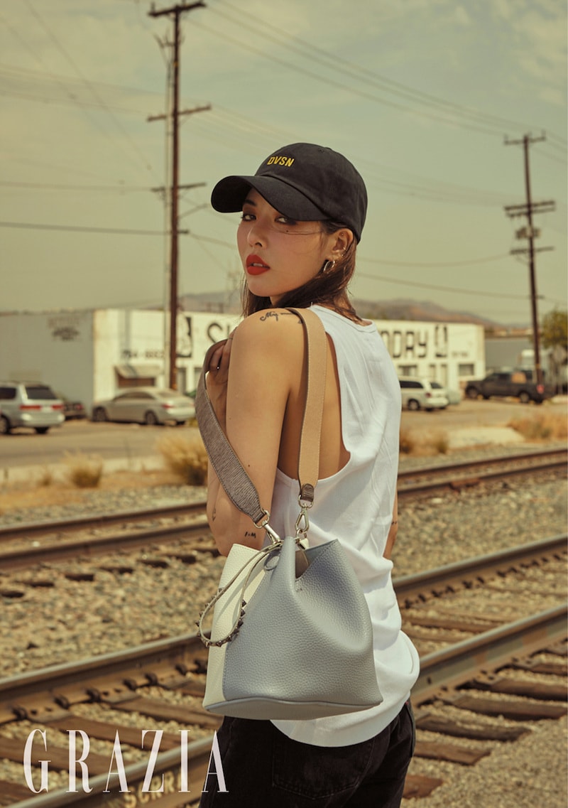 패션매거진 그라치아는 공식 인스타그램을 통해 현아의 파파라치 컷을 공개했다. 사진 속 현아는 화보 촬영 차 떠난 LA의 수영장과 기찻길을 배경으로 카리스마 있는 눈빛과 포즈를 취하고 있다.