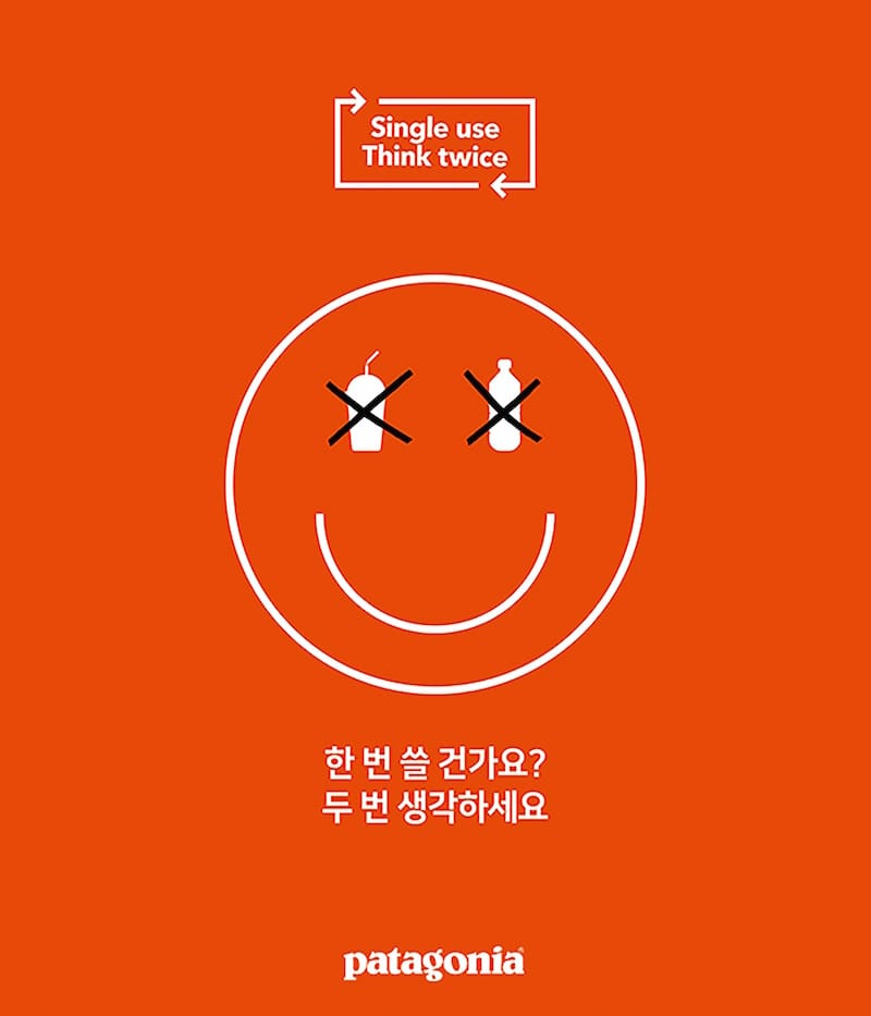 파타고니아의 캠페인 타이틀 ‘Single use Think twice’는 “한 번 쓸 건가요? 두 번 생각하세요”라는 의미로 지구와 인간을 병들게 하는 일회용 플라스틱 사용 습관을 한 번쯤 다시 생각해보자는 뜻을 담았다.