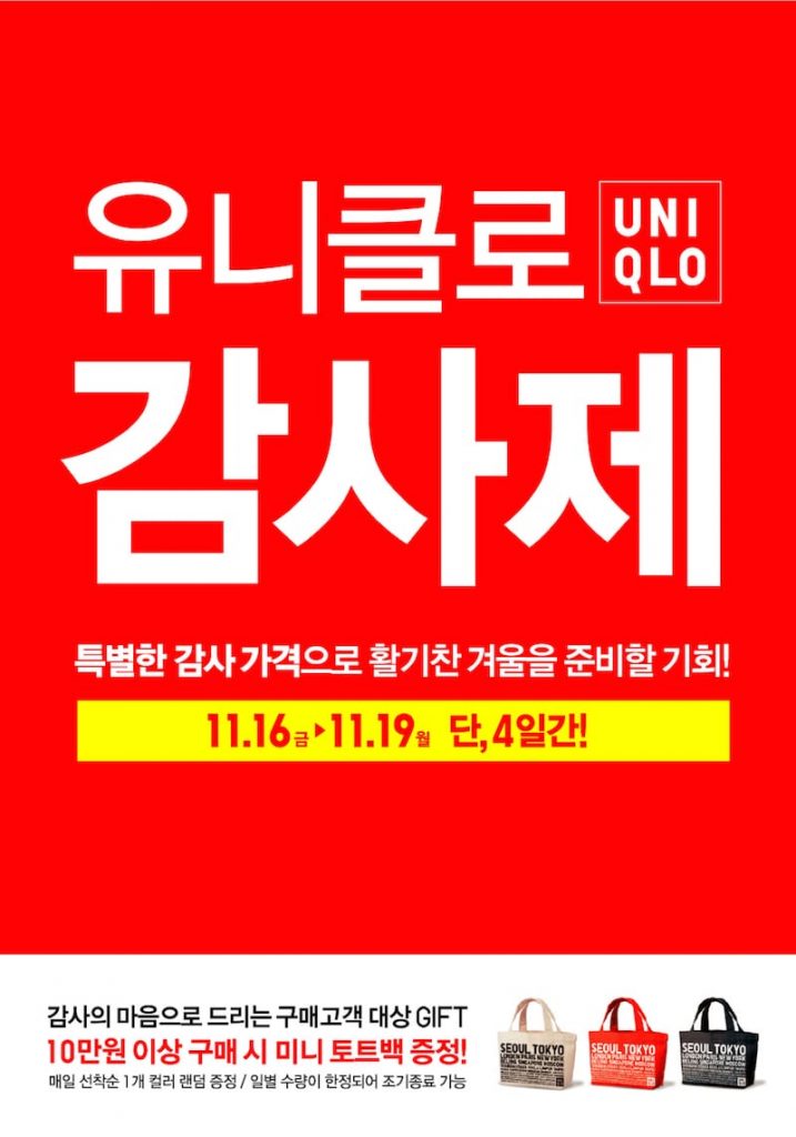 유니클로(UNIQLO)가 오는 16일부터 19일까지 4일간 유니클로의 다양한 겨울 상품들을 특별한 가격에 준비할 수 있는 ‘유니클로 감사제’를 실시한다.