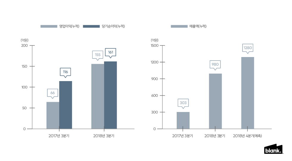 블랭크의 2018년 3분기 누적 매출은 980억 원으로 집계됐다(연결실적 기준). 이중 국내 매출은 968억 원으로 2017년 3분기 대비 약 223% 성장했다. 2018년 3분기 매출은 339억 원으로 전년 동기 127억 원에 비해 약 167% 가량 증가한 것이다. 2018년 3분기 누적 영업이익은 155억 원으로, 누적 당기순이익은 161억 원에 달한다.
