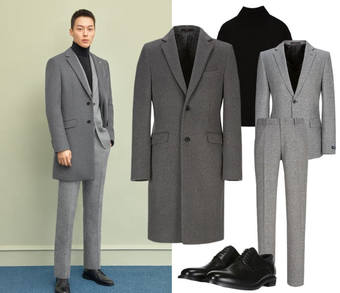 그레이 코트를 선택했다면 같은 톤의 밝은 그레이 수트로 포멀한 스타일을 연출해보는 건 어떨까. 보카시 그레이 멜란지 원단이 사용된 수트 재킷과 슬랙스, 블랙 터틀넥 니트는 도회적이면서 고급스러운 느낌을 가져다준다. 마지막으로 클래식한 플레인 토 구두로 마무리하면 도시적인 느낌의 비즈니스룩이 완성된다.