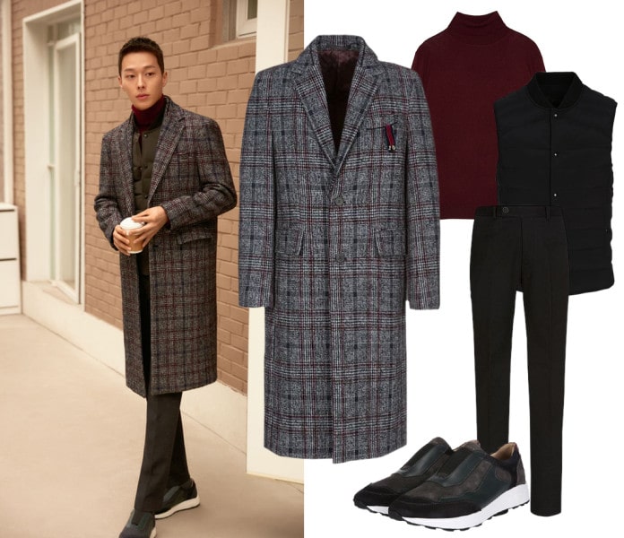 화려한 체크 코트를 선택했다면 무난한 아이템들을 함께해 코트를 더욱 돋보이게 하는 것이 좋다. 버건디 니트와 블랙 팬츠, 경량 패딩 베스트는 엑티브 하면서 캐주얼한 이미지를 배가시킨다. 여기에 모던한 스니커즈를 더하면 체크 코트를 활용한 비즈니스 캐주얼룩을 연출할 수 있다.