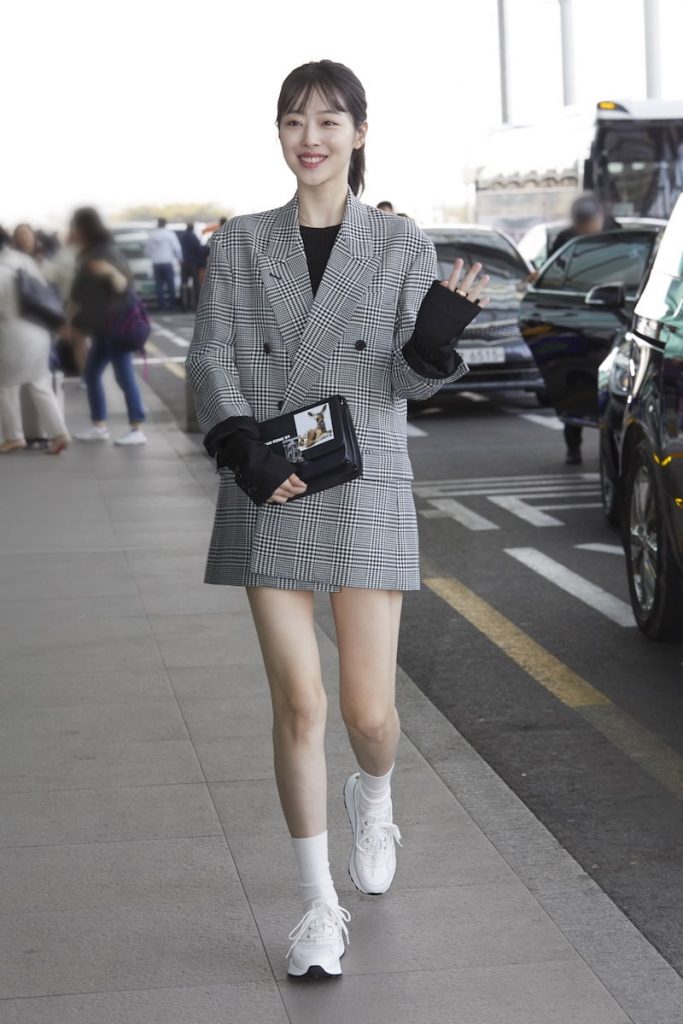 이날 오후 김포공항에 모습을 드러낸 설리는 오버사이즈 재킷을 미니 원피스처럼 연출해 시크함과 로맨틱함을 모두 놓치지 않은 스타일링을 선보였다. 발목까지 올라오는 양말과 화이트 스니커즈로 트렌디함까지 살린 설리는 백으로 마무리한 포인트 룩으로 관심을 모으고 있다.