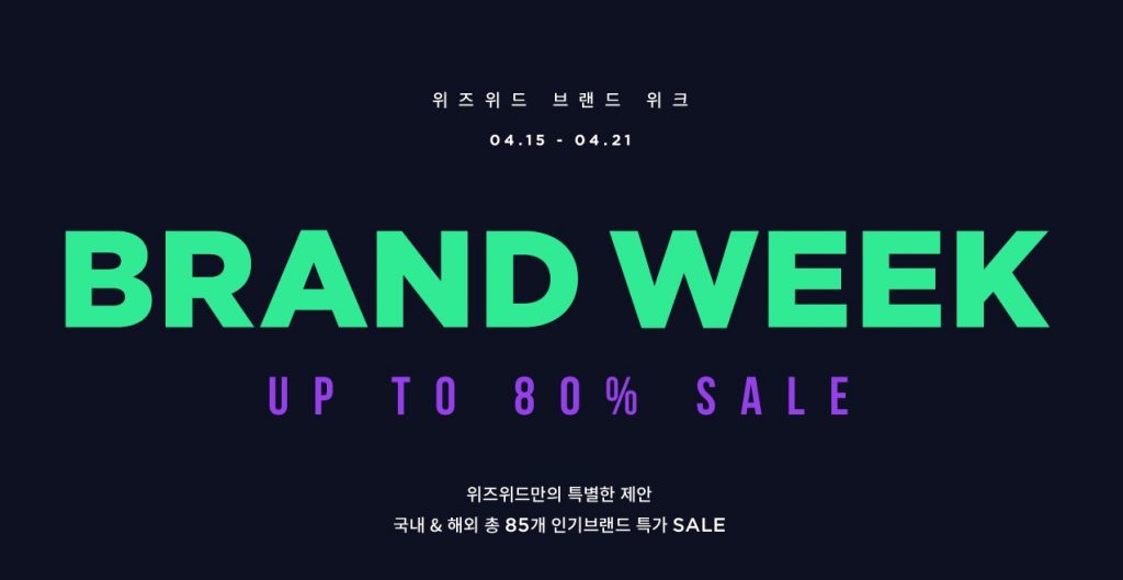 위즈위드(WIZWID)가 4월 15일부터 21일까지 최대 80% 할인 하는 ‘브랜드 위크’ 기획전을 진행한다.