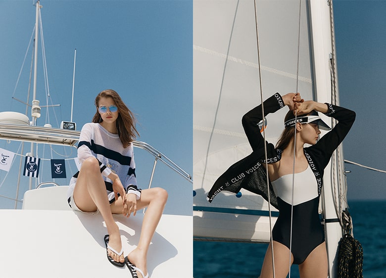 여유로운 크루즈 여행에 어울릴 듯한 메쉬 소재의 니트와 닻 포인트를 더한 브로치가 더해진 재킷, 레터링 포인트 사이클링 쇼츠 외에도 휴양지 룩으로 안성맞춤인 원피스, 여름용 카디건, 스트라이프 숄더백 등 총 15가지 스타일을 선보인다.