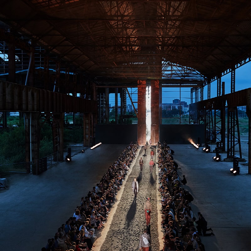 이탈리아 밀라노 외곽에 위치한 거대한 규모의 천고 높은 폐공장 건물에서 에르메네질도 제냐 XXX 2020 여름 컬렉션 캣워크가 펼쳐졌다.
