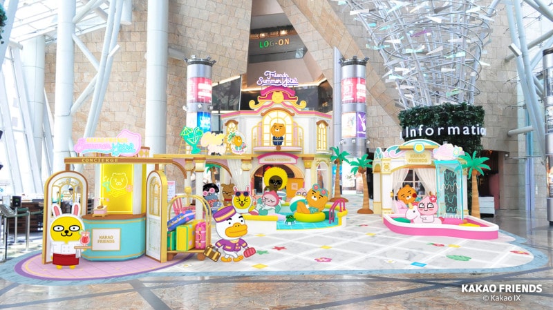 ‘프렌즈 썸머 호텔’이라는 컨셉으로 꾸며진 매장 내외부에는 대형 카카오프렌즈 캐릭터 구조물들을 곳곳에 설치, 팝업스토어를 하나의 포토존으로 구성해 눈길을 끈다. 풀장 안에서 튜브를 타고 즐겁게 놀고 있는 라이언과 어피치, 썬 베드 위에서 한껏 여유를 즐기는 네오와 프로도 등 한 여름을 즐기는 다채로운 캐릭터들로 공간을 조성해 방문객들의 발길을 사로잡을 예정이다.