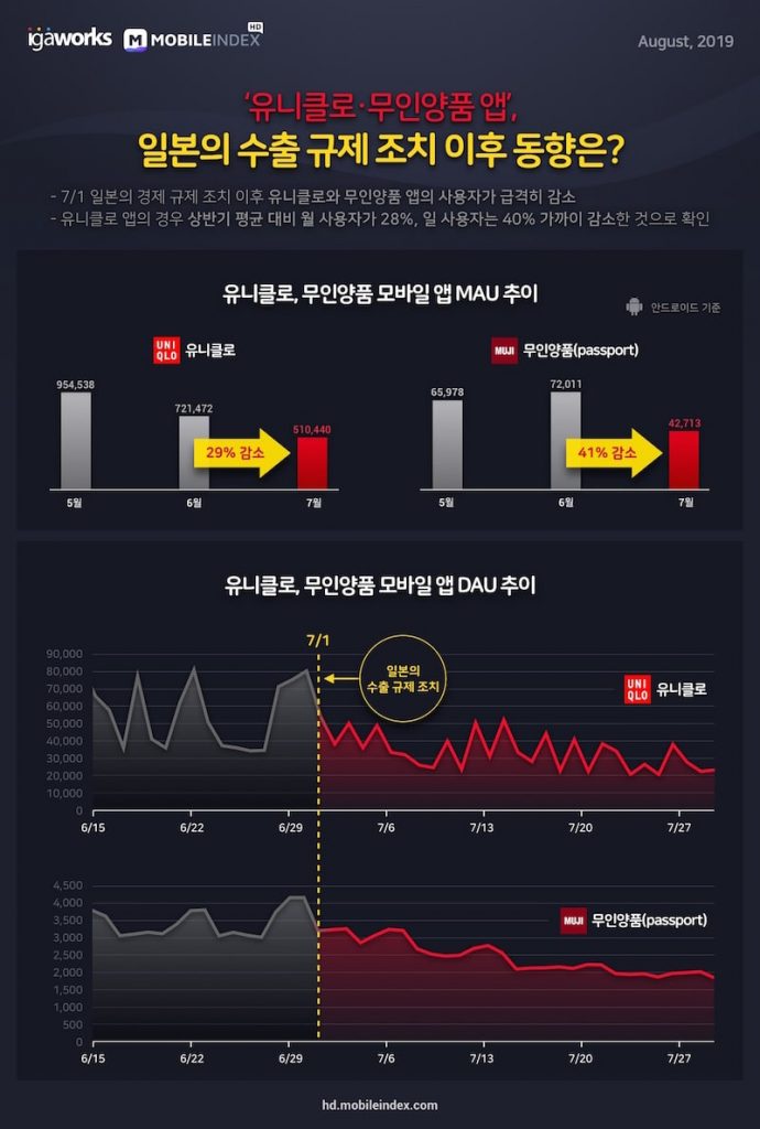 지난 7월 1일, 일본의 경제 규제 조치 이후 유니클로와 무인양품 앱의 사용자가 급격히 감소한 것으로 나타났다.