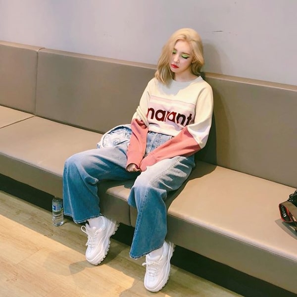공개된 사진 속에서 그녀는 대기실로 보이는 장소에서 짙은 화장과 어울리는 화려한 무대 의상을 잠시 뒤로한 채 빈티지한 핑크 로고 배색 맨투맨과 와이드 청 팬츠를 착용하고 올 화이트의 어글리 슈즈를 매치해 꾸안꾸룩의 정석을 보여주며 패셔니스타의 면모를 가감없이 드러냈다.