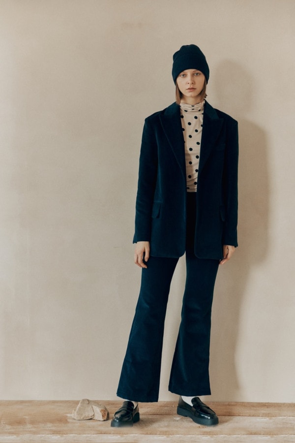재킷은 모던한 피크드 라펠에 여밈이 없는 오픈 스타일로 카라에 배색 포인트 및 테일러링 디테일을 살려 포인트를 줬다. 팬츠는 무릎부터 폭이 넓어지는 부츠컷 라인으로 날씬하고 여성스러운 실루엣을 연출하며 밑단의 자연스러운 트임이 포인트다.