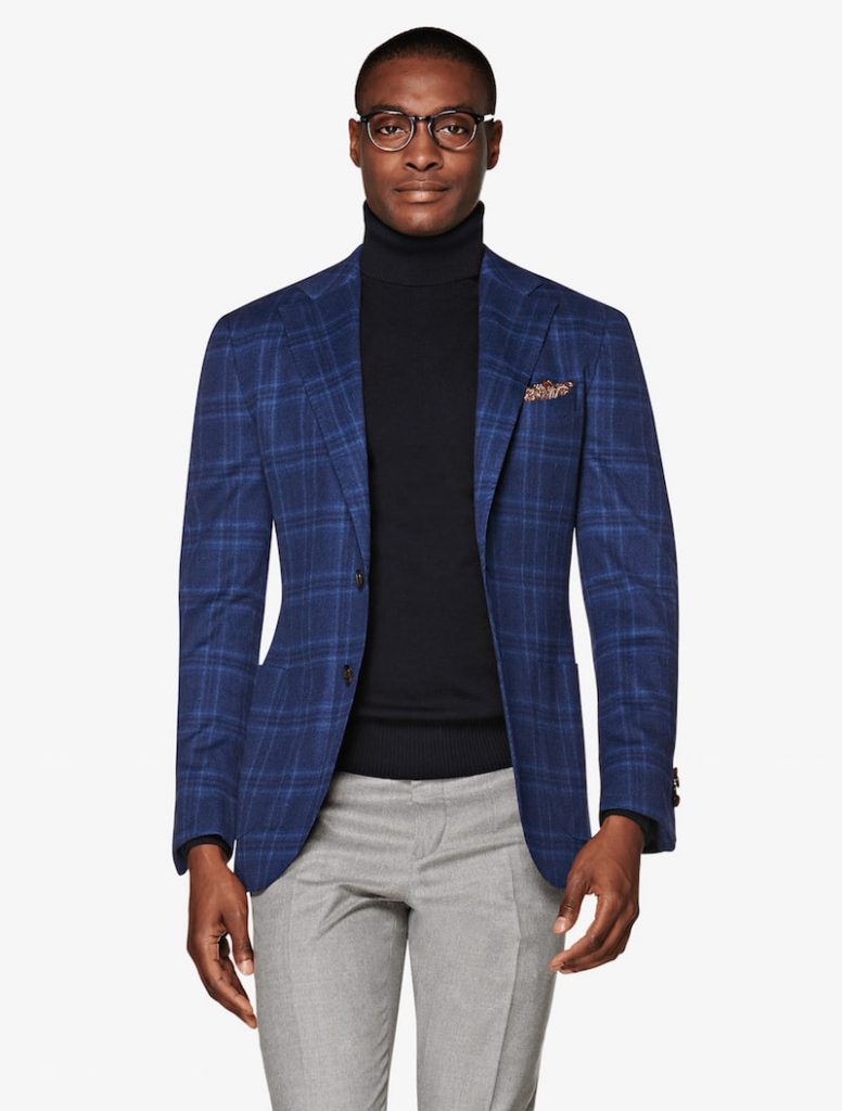 네덜란드 남성복 수트서플라이(SUITSUPPLY)는 고급스러운 블루 체크 재킷을 제안했다. 수트서플라이의 블루 체크 재킷은 이태리 캐시미어 혼방 소재를 적용했으며, 패치 포켓, 어깨 주름 등 디테일로 포인트를 줬다. 이와 함께 블랙 터틀넥 니트, 그레이 톤의 팬츠를 매치하면 심플하면서 스타일리시한 룩을 연출할 수 있다.