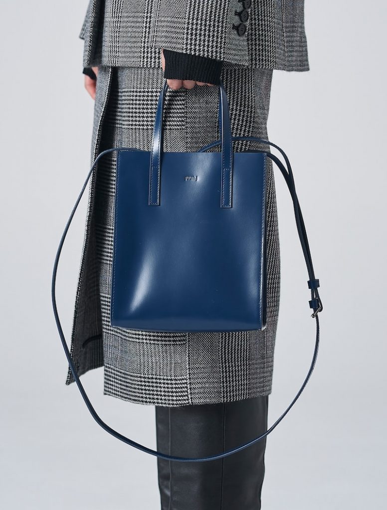 글로벌 브랜드 준지(JUUN.J)의 미니 크로스백은 소가죽 소재에 깊은 블루 빛을 더해 매력적이며, 미니멀한 스퀘어 디자인이 캐주얼 룩은 물론, 포멀 룩에도 잘 어우러진다.