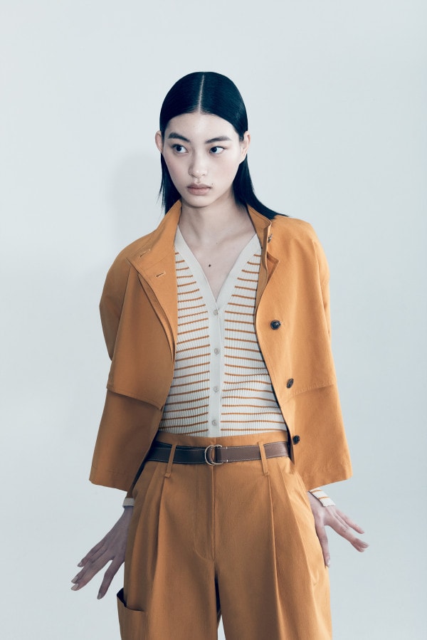 구호는 경쾌한 숏 트렌치 재킷, 줄무늬 카디건, 볼륨감 있는 카고 팬츠를 오렌지 빛의 셋업으로 매치해 봄 분위기가 물씬 묻어나는 룩을 보여줬다.