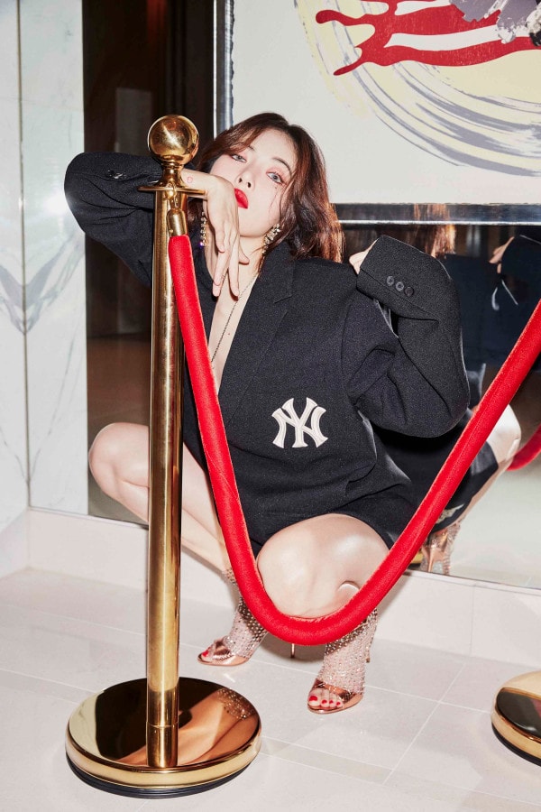 MLB에서 새롭게 선보이는 테일러드 자켓은 어깨부터 허리 라인까지 딱 떨어지는 실루엣으로 클래식하면서도 고급스러운 디자인이 특징이다. 여기에 뉴욕양키스 로고 플레이와 패치워크가 더해져 럭셔리 스트리트 무드를 강조했다.