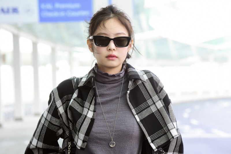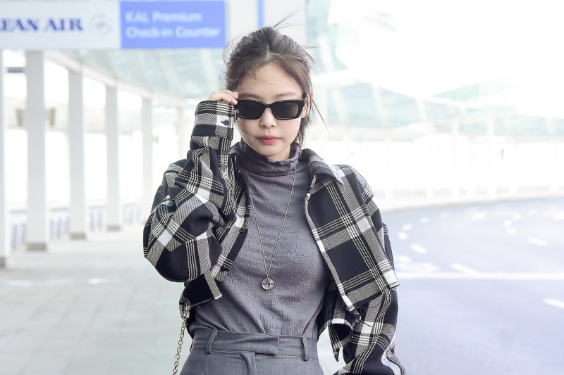 블랙핑크 제니는 그레이 톤의 룩, 크롭한 체크 재킷에 블랙 선글라스를 더해 시크한 공항패션을 완성했다. 이날 제니의 쿨한 공항패션을 완성해준 선글라스 곧 공개될 제니와 젠틀몬스터의 협업 제품으로 알려졌다.