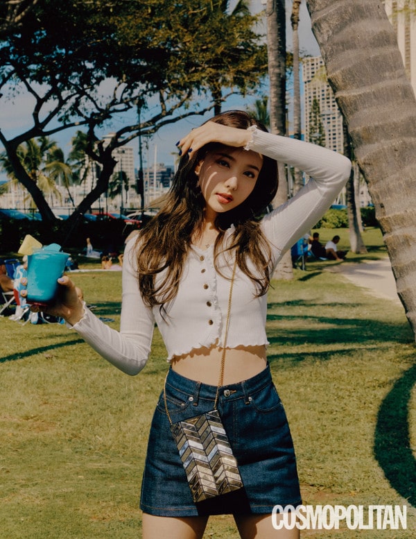 패션 매거진 코스모폴리탄과 함께한 이번 화보는 하와이 호놀룰루를 배경으로 나연 특유의 상큼하고 사랑스러운 분위기를 담아내 눈길을 사로잡는다. 화보 속 나연은 체크 크롭 니트와 셋업 투피스 등의 트렌디한 의상에 각각 질스튜어트 액세서리의 백을 매치해 세련된 스프링 룩에 포인트를 더했다.