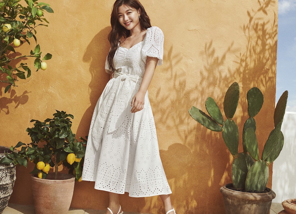 또한 이번 H&M의 썸머 캠페인에서는 브로드리 앙글레즈 디테일의 의상이 다양하게 선보이는데, 김유정은 화이트 컬러의 브로드리 앙글레즈 탑과 스커트를 매치하여 한층 여성스럽게 보이는 가 하면, 블랙 브로드리 앙글레즈 스커트에는 질감은 다르지만 컬러가 같은 블랙 탑을 함께 착용하여 스타일리시한 룩을 연출할 수 있다.