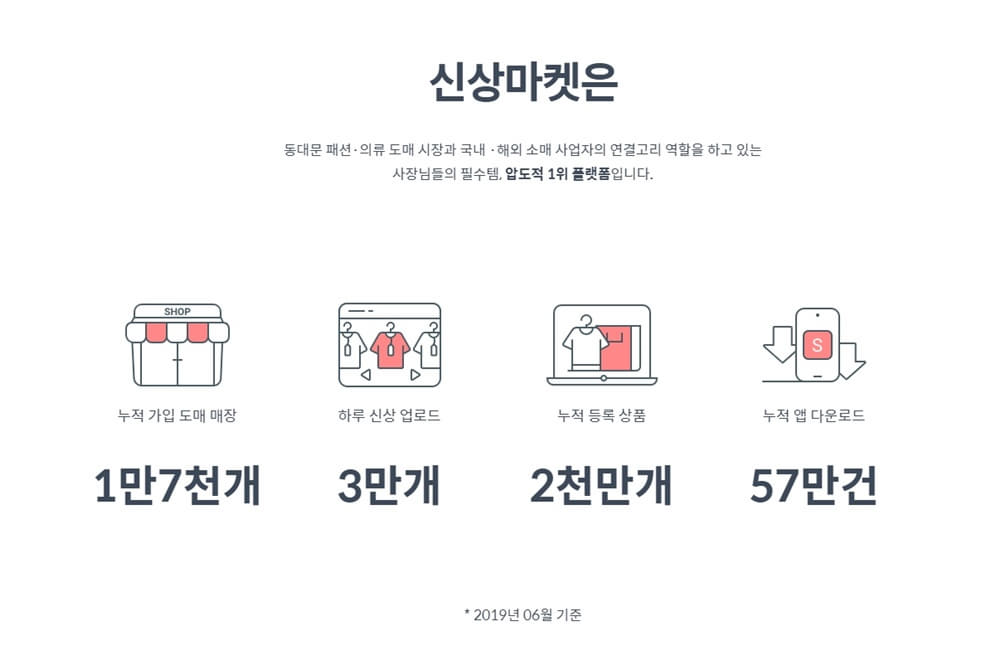 ‘신상마켓은’은 동대문 패션 도매시장과 국내외 소매 사업자를 연결하는 B2B 패션 플랫폼이다. 지난 2013년 베타서비스를 시작해 지난 4월 누적 거래액 1조원을 돌파했다. ‘신상마켓’을 통해 도매는 신상품 홍보하는 동시에 거래처를 확보하고 소매 업체는 수백만 개에 달하는 상품을 모바일을 통해 쉽게 탐색할 수 있다. 주문, 배송까지 ‘신상마켓’에서 바로 진행해 도매사업주는 재고에 대한 부담을 덜 수 있고 소매사업주는 신상품을 한발 빠르게 소비자에게 선보일 수 있는 것이 특징이다.