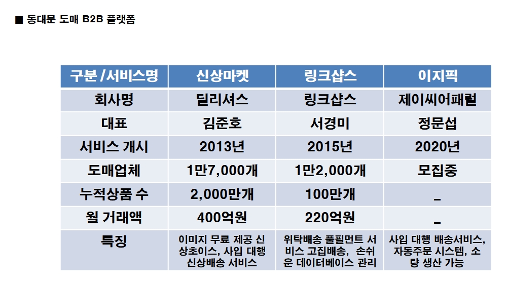 이들 기업들은 각각 ‘신상마켓’, ‘링크샵스’, ‘이지픽’ 등 동대문 도매 상가를 중심으로 패션 B2B 플랫폼을 운영 중이다. 기존 동대문의 오프라인 거래를 온라인과 모바일로 바꾸는 것이 비즈니스의 핵심 전략이다.