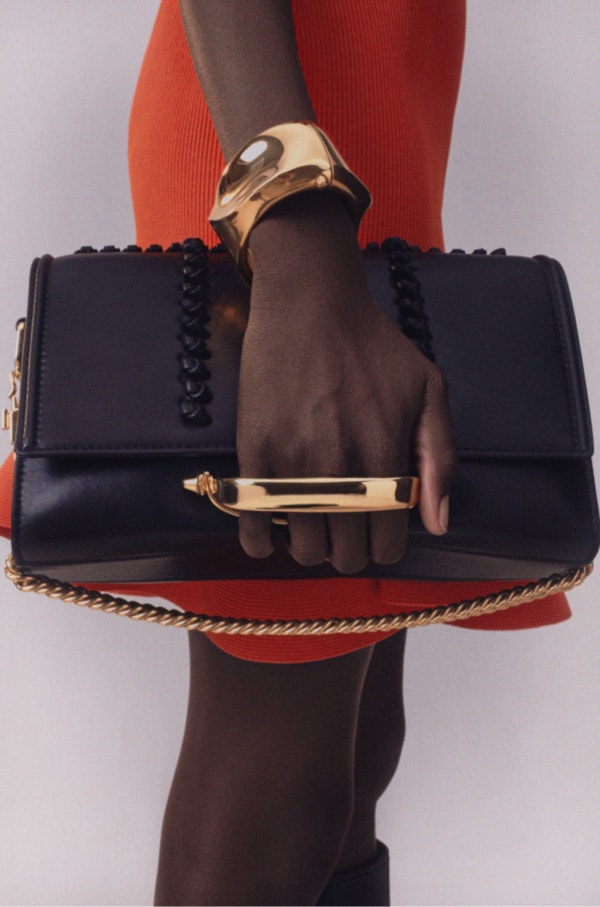 알렉산더 맥퀸의 새로운 백으로 떠오르고 있는 ‘스토리 백’은 시즌 색상으로 재 탄생했다. 그 중 “스토리 숄더 백”에는 강하게 대비되는 매듭, 스터드 장식이 더해진 제품으로 선보인다.