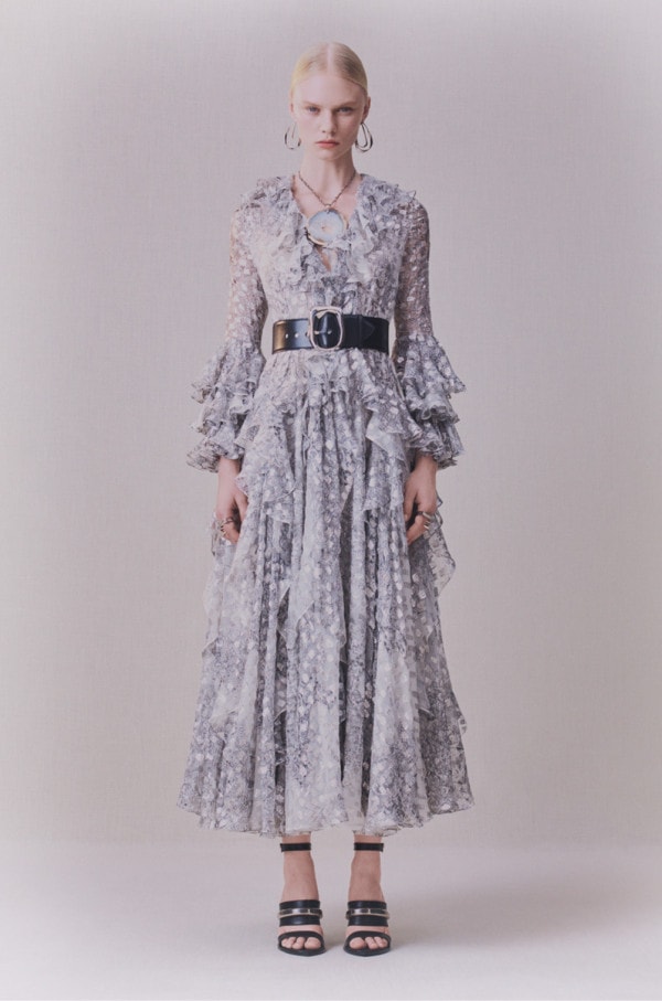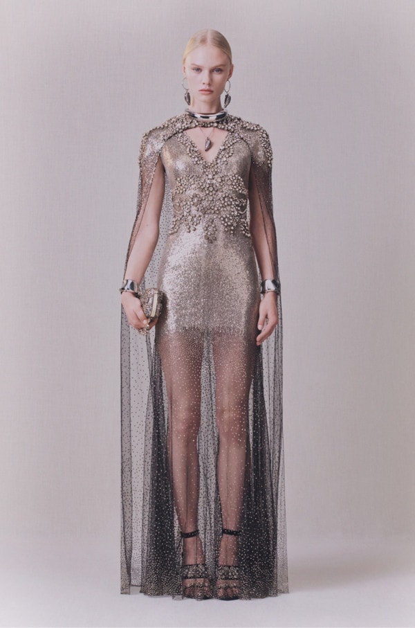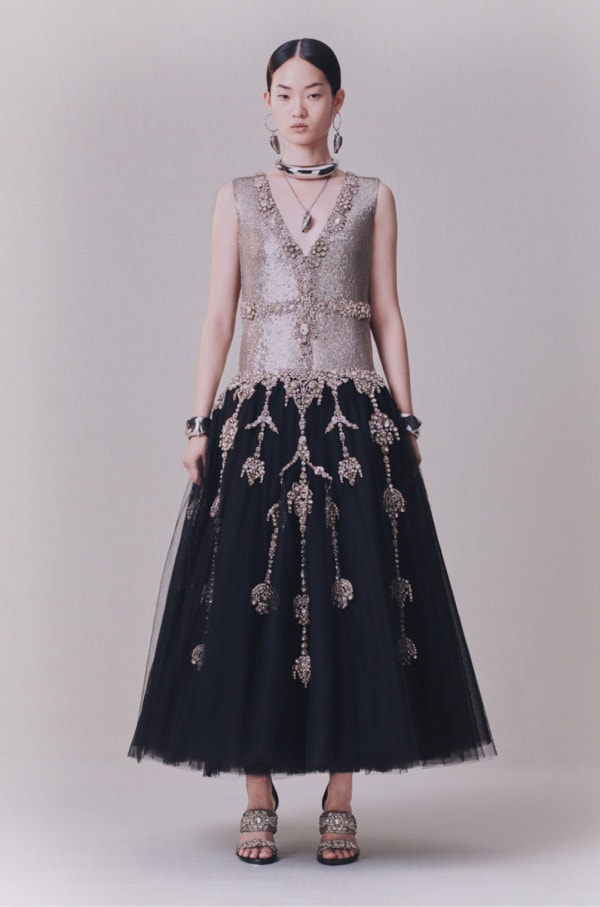 특히, 알렉산더 맥퀸은 이번 컬렉션에서 붓꽃, 엉겅퀴, 글래스고 장미 등 다양한 꽃에서 영감 받은 룩을 선보이기도 했다. 서로 얽힌 엉겅퀴 모양을 아르누보 풍의 흑옥으로 수놓아 완성한 하네스부터 그라데이션 시퀸으로 굽이치는 붓꽃 형상을 수놓은 섬세한 튤 드레스까지 ‘대지의 풍경 속의 꽃’이라는 날 것에서 받은 영감들을 매혹적인 룩들로 명민하게 풀어냈다.