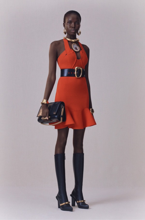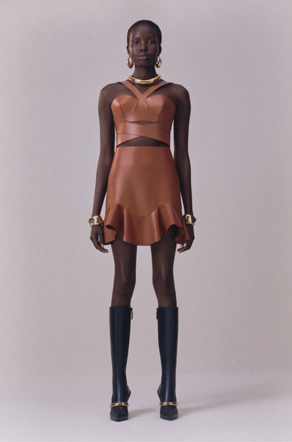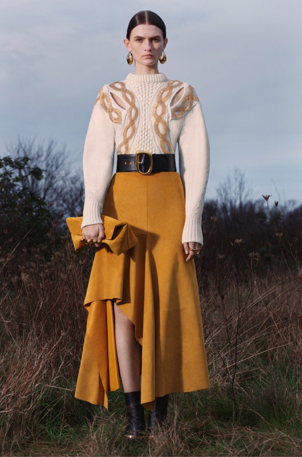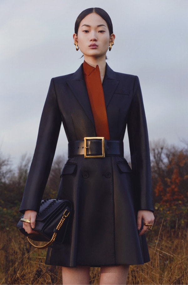 가을이 물씬 느껴지는 탠, 딥 오렌지, 옐로 컬러 팔레트는 가죽-니트-스웨이드 등 소재들과 만나 포근한 분위기를 자아내는 룩을 완성했다.