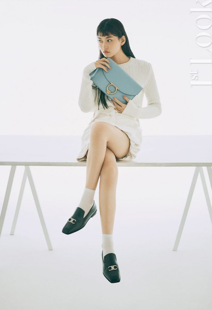 도연은 골드 간치니 클로저가 특징인 마고 클러치와 스퀘어 간치니 장식이 돋보이는 세사로 로퍼를 함께 매치하여 스타일링의 멋을 더했다.