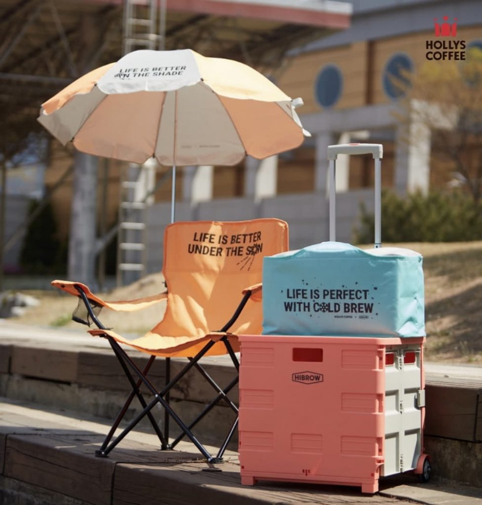 할리스커피는 배우 이천희와 건축가 이세희 형제가 운영하는 아웃도어 브랜드 ‘하이브로우’와 협업해 캠핑 굿즈 3종을 순차적으로 출시했다. 캠핑이나 피크닉에 유용한 ‘릴랙스 체어 & 파라솔 세트’와 ‘빅 쿨러 백’, ‘멀티 폴딩 카트’는 출시와 동시에 품절 사태를 빚었다. 스타벅스가 내놓은 서머 체어과 서머 레디백, 투썸플레이스와 커버낫의 콜라보 캠핑 굿즈 역시 온·오프라인에서 뜨거운 호응을 얻었다.