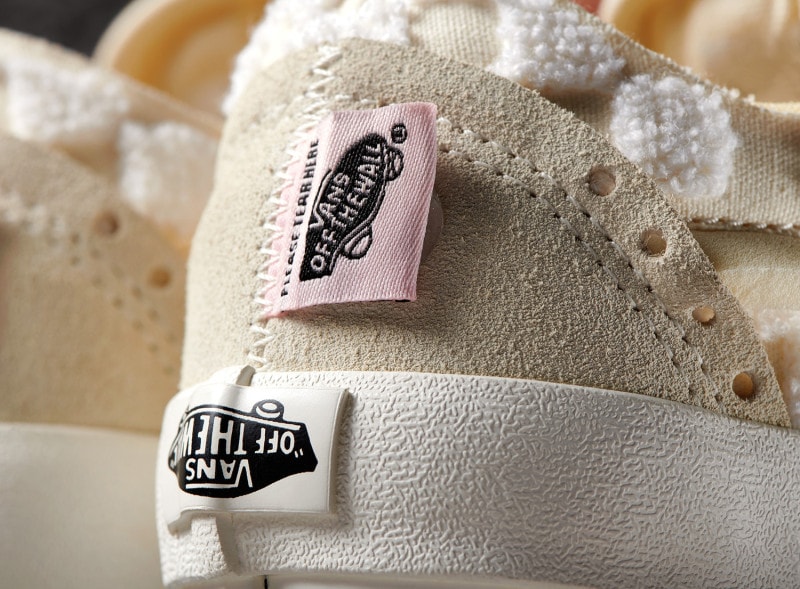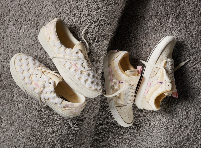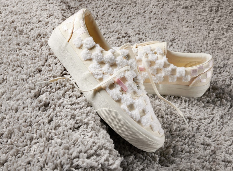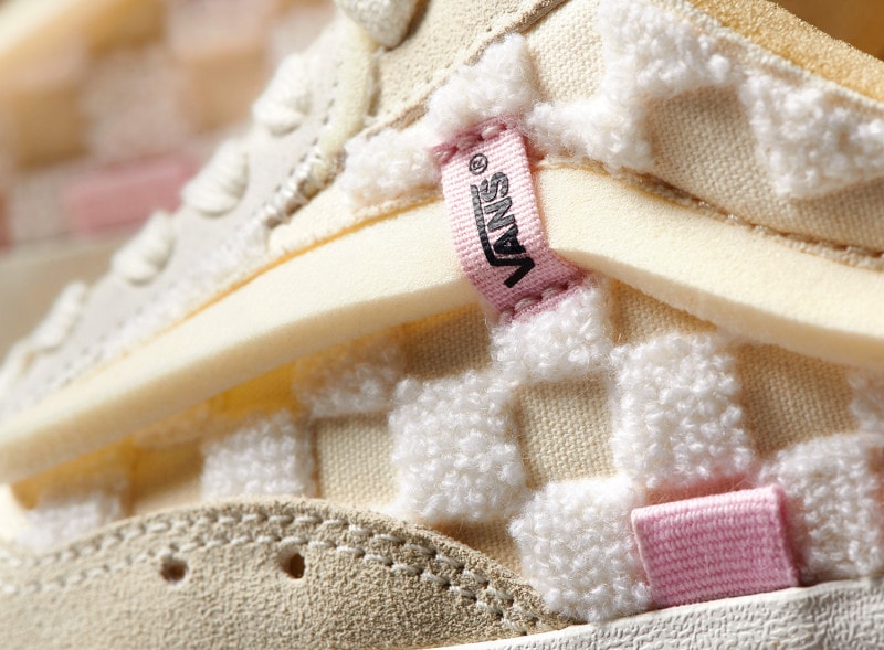 이번에 공개된 셔닐 팩의 메인 아이템인 에라 스타일에는 오프-화이트 컬러의 미드솔과 캔버스 소재 어퍼가 적용되었고, 여기에 아일릿과 스티치 그리고 슈레이스로 포인트를 주었다. 입체적인 체커보드를 표현하기 위해 전면 패널과 측면 패널에 화이트 컬러의 셔닐 소재를 더해 눈이 내린 듯한 효과를 더하였고, 뒤축에 연한 핑크 컬러의 실을 이용해 체커보드 패턴을 수 높았다.