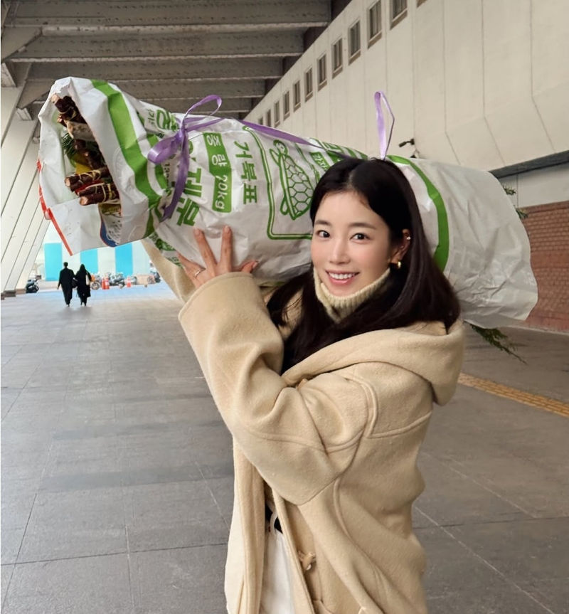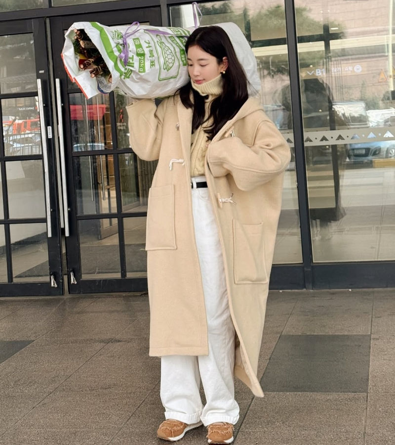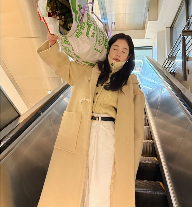 기은세는 화이트 팬츠에 뉴트럴 톤의 코트와 니트를 매치해 따뜻하면서도 차분한 겨울 룩을 연출했다.