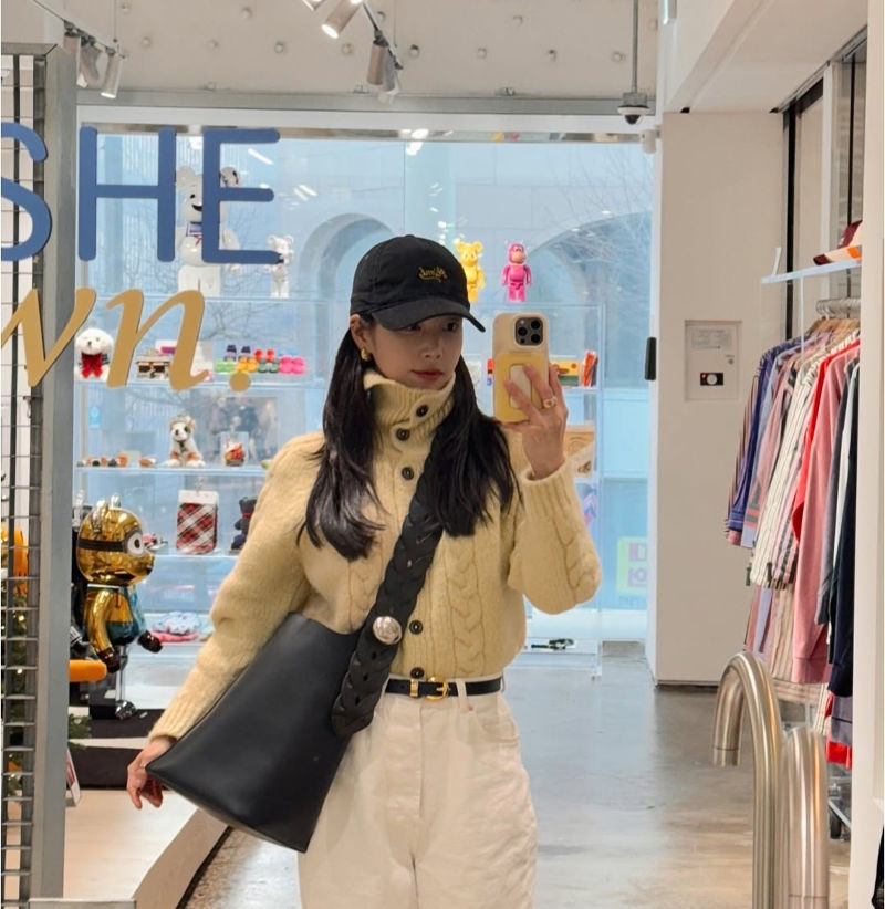 슈즈로 초이스한 브라운 컬러의 스니커즈는 룩의 무게 중심을 잡아주고, 계절감을 강조할 수 있는 좋은 선택지가 된다. 이너로 매치한 니트의 케이블 짜임 디테일은 포근한 겨울의 느낌을 한층 더 잘 살려줬다.