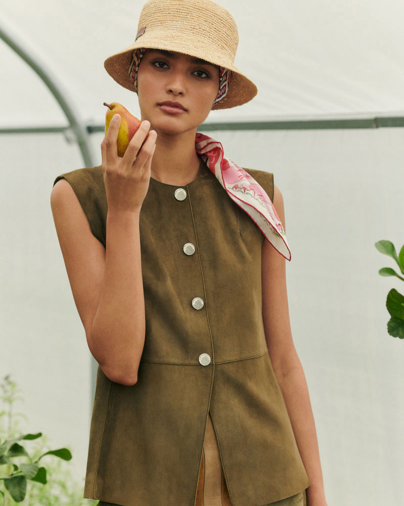 롱샴 시그니처 레더는 가드닝 테마를 반영해 허리 라인을 강조한 슬리브리스 질렛과 스냅 버튼 스트랩이 달린 에이프런 드레스로 전개되며, 그 외 벨벳 소재의 레더 사파리 재킷과 크롭탑 세트도 눈길을 끈다. 가드닝과 전원 생활의 상징인 오버롤은 에이프런 드레스부터 플레이 수트까지 만나볼 수 있다.