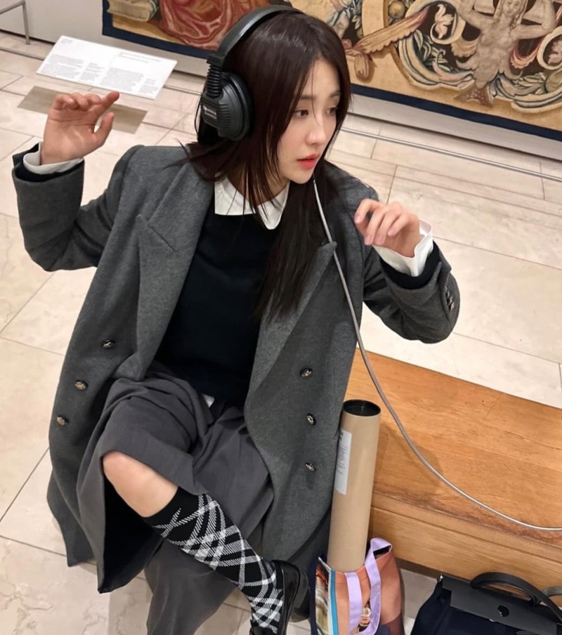 일단, 화이트 셔츠와 블랙 니트를 매치해 클래식한 분위기를 연출하고, 여기에 오버사이즈 그레이 롱 코트를 매치해 포멀한 무드를 더했다. 하의로 착용한 미디 스커트와 체크 패턴 니삭스는 그녀의 감각적인 패션센스를 잘 보여준다.