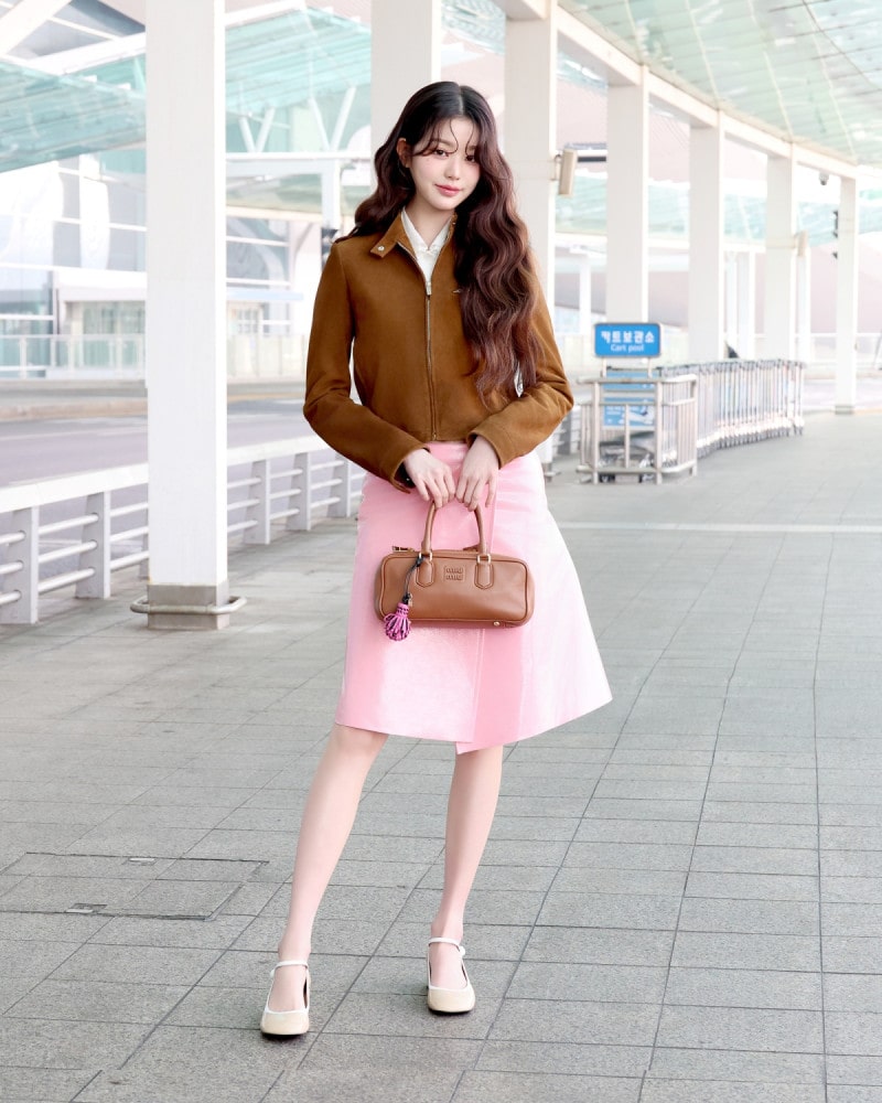 오늘 장원영이 착용한 제품은 모두 미우미우(Miu Miu) 제품으로, 레트로한 디자인의 스웨이드 재킷과 화이트 컬러의 슬러브 포플린 셔츠, 고급스러운 광택감이 특징인 핑크 나플락 랩어라운드 스커트로 러블리한 패션을 연출했다. 여기에 페미닌한 디자인의 세련된 펌프스를 착용해 그녀의 사랑스러움을 더욱 업시켜 주었다.